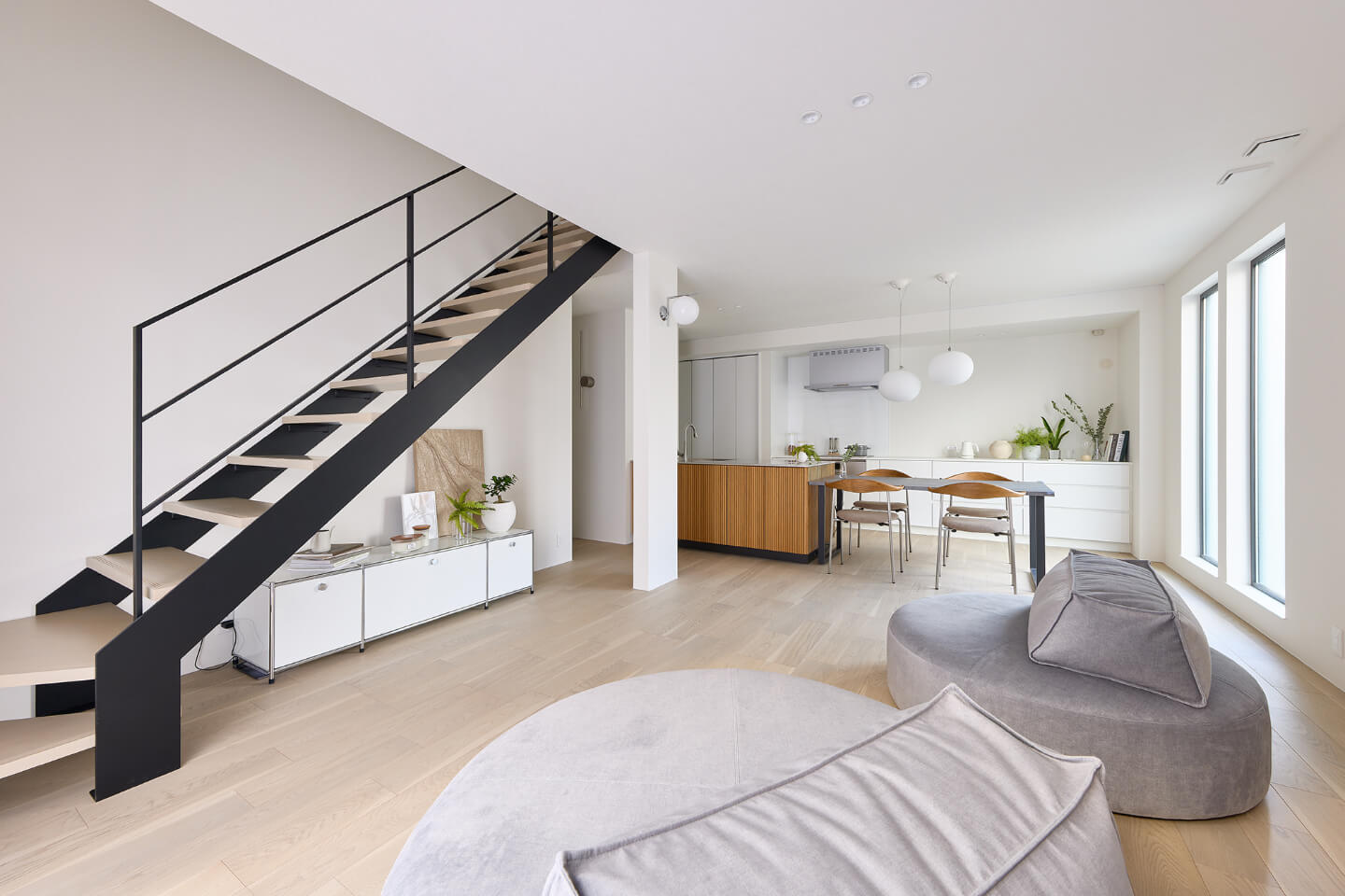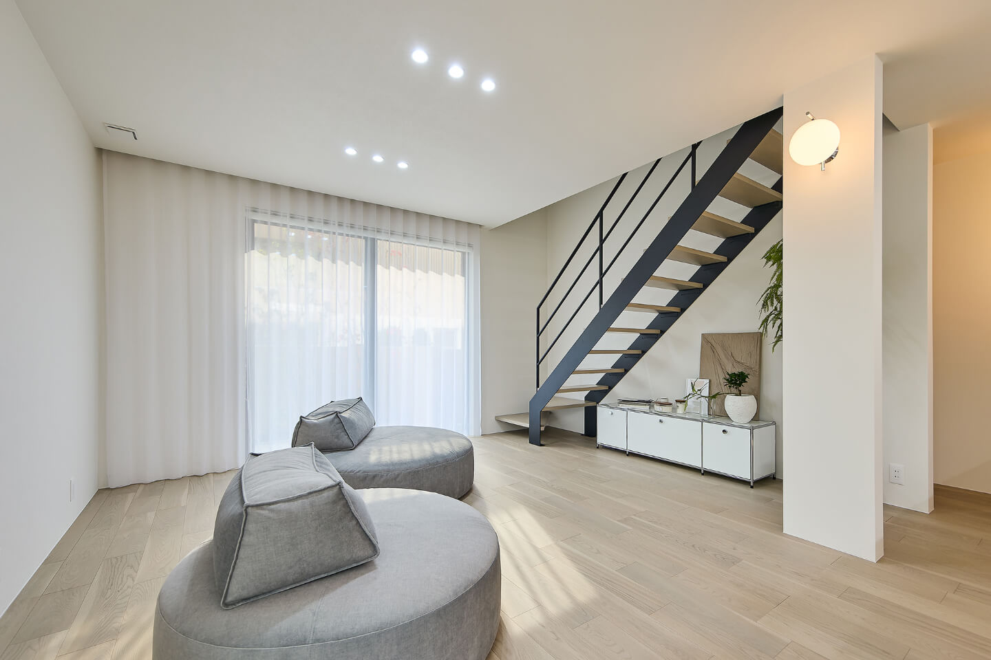 円形ソファが自然と会話を育み、小さなテラスが四季の移ろいを身近に。アイアン階段が視界の広がりを演出し、どこにいても心地よい開放感に包まれます。