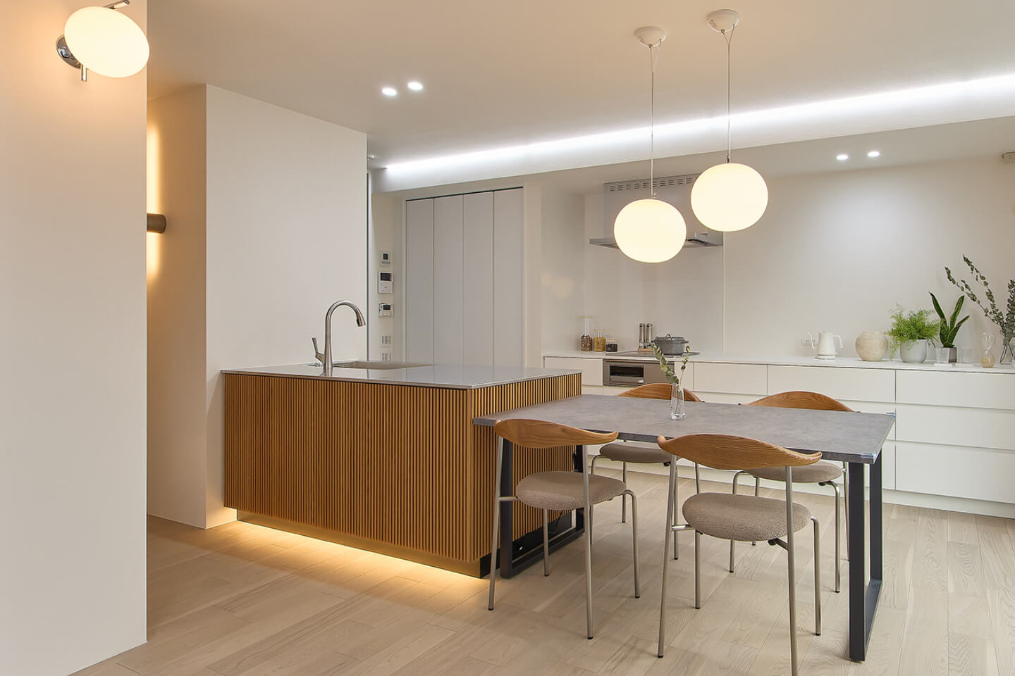 約21帖のLDK は、白を基調としたシンプルな空間に美しい照明が、家族の団らんを優しく照らします。毎日の食事の準備や洗濯動線もスムーズな家事ラク設計もポイント。